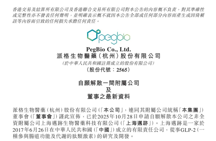 2025年11月3日,派格生物医药-B(以下简称“派格生物”)宣布,公司已于2025年10月28日申请自愿解散公司的非全资附属公司上海迈迹生物医药科技有限公司(以下简称“上海迈迹”)。