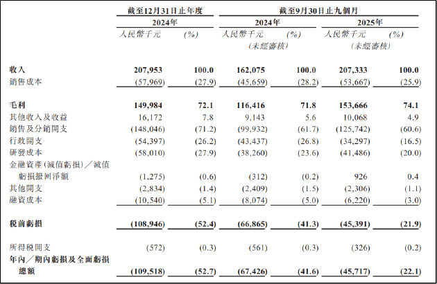 从毛利率来看,公司毛利率维持在相对健康水平,2024年全年和2025年1-9月分别为72.1%、74.1%。但销售费用的高企严重侵蚀了盈利空间。2025年1-9月,公司销售及分销开支达1.26亿元,同比增长约26%,销售费用率达60.87%。反观研发费用率仅约20%,“重营销,轻研发”现象突出。