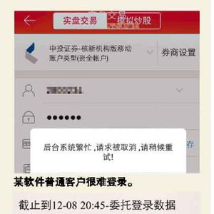 而在投资者交流平台,关于股票软件卡壳的吐槽更是不胜枚举。“渤海证券有时候下不了单”、“12月3日13:30左右,方正证券交易系统的融资交易非常缓慢,显示的额度根本买不了那么多,基本每笔都要延迟20~30秒”、“广发证券的行情滞后。”……有股民抱怨,“好不容易等来了牛市,天天这样瘫痪,这个股没法炒了。”