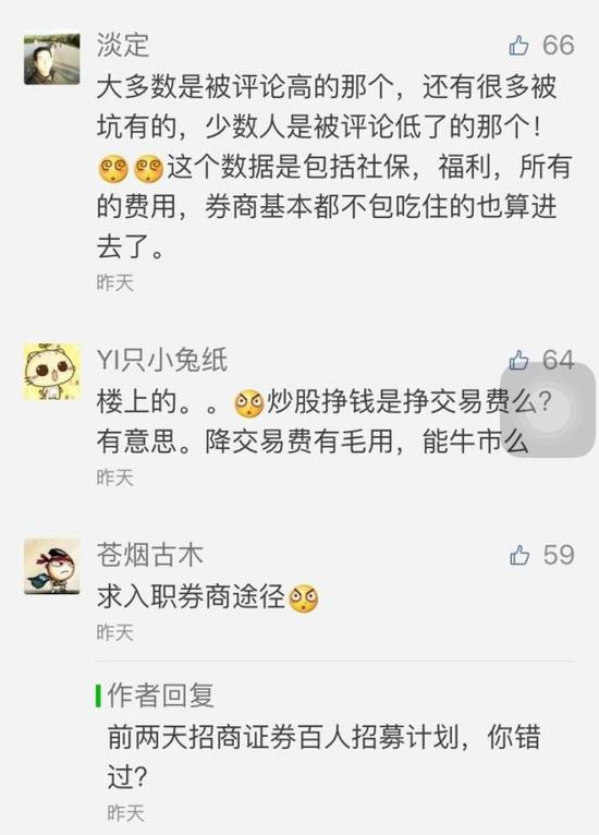 有券商朋友向记者吐槽说:我们的年薪也上榜了,但我们的实际待遇在行业就是中等,真心不高,结果现在排在前面了,“收到至少10个人的调侃!”