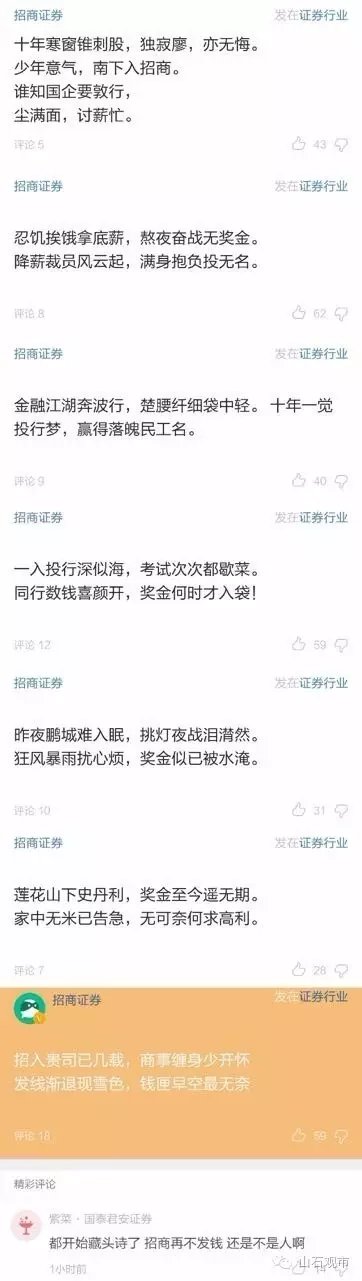 “山石兄好,我爆下料中信证券后台的奖金4年前是春节发,2年前开始一半次年4月发,另一半分12个月发。就算只有2万也要分12月,今年到现在还没发。”