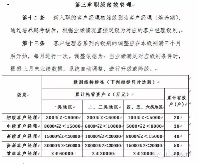 在征求意见稿中,华泰证券加大了净增资产考核力度。此外,加大了理财产品的销售和考核力度。这样的话,客户经理将不得不销售基金,否则会被扣钱。对客户经理资产规模的要求极高。8000万的资产规模在其他券商不是首席也会是骨干的客户经理。而在华泰仅是最初级的。