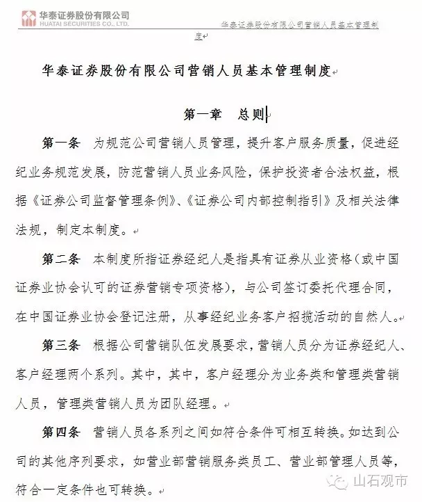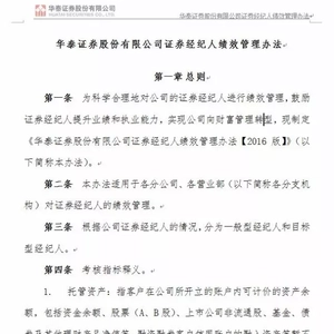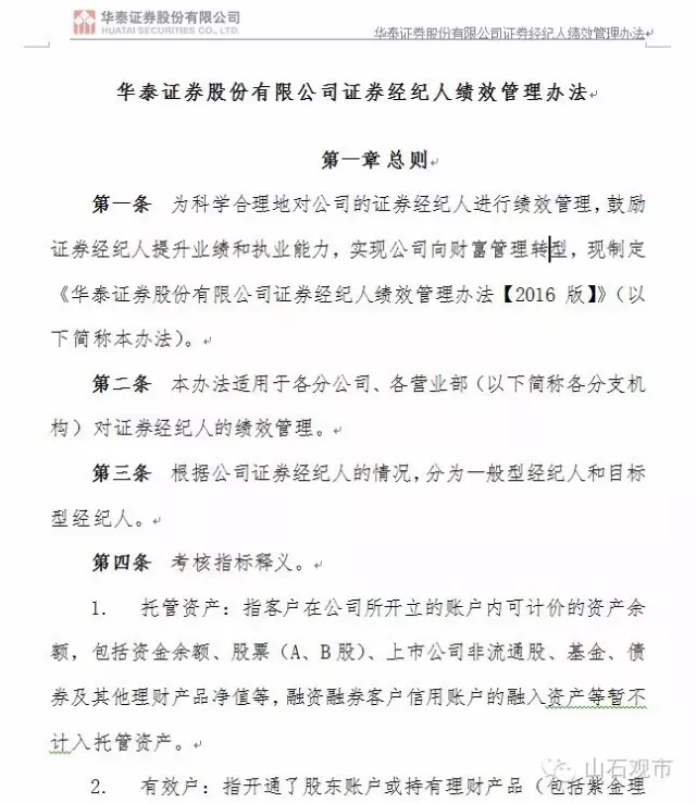 首先是华泰证券的三个内部文件《2016证券经纪人绩效管理办法(征求意见稿)》、《2016营销人员基本管理制度(征求意见稿)》、《2016客户经理绩效管理办法(征求意见稿)》。