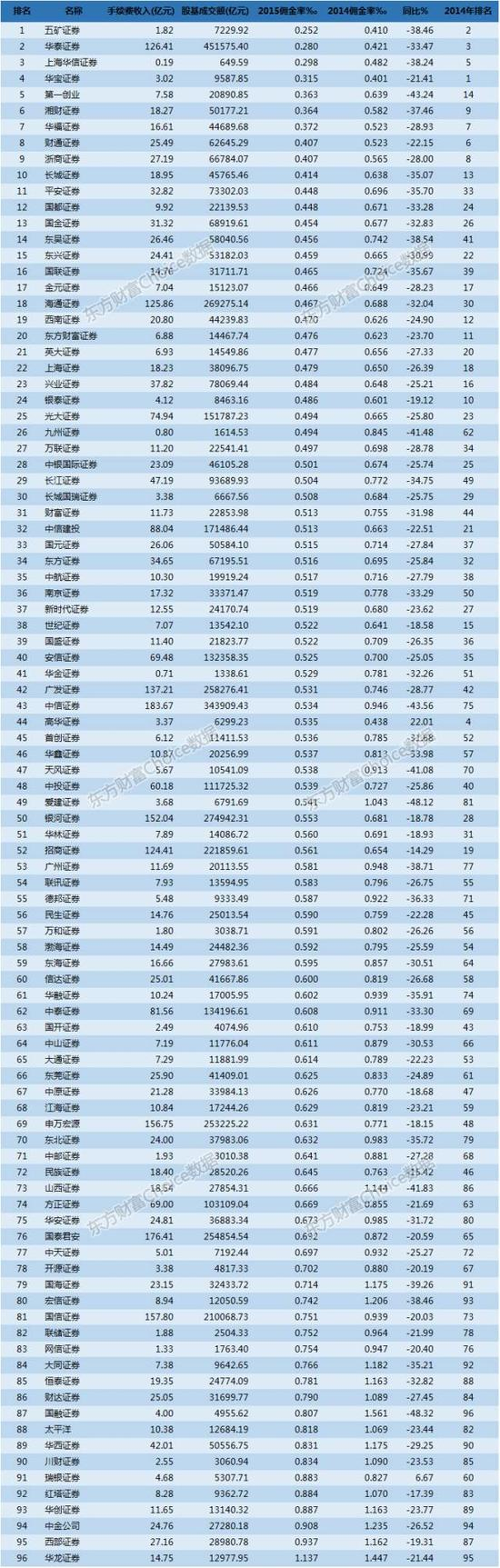 近百家券商佣金率排名