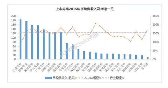上市券商方面,总共23家证券公司2015年实现手续费收入合计1684.43亿元,占整个行业该项收入的比例为62.6%,较2014年的678亿元增长约148.4%。共有8家券商手续费收入超过百亿元,排名前3的分别是中信证券、国泰君安和国信证券。同时,手续费收入对营业收入的贡献也有所上升,从2014年的35%提高至2015年的43%。