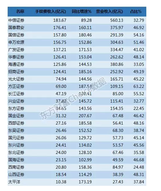 手续费收入增速方面,由于去年市场交易金额的大幅上涨,各家券商均有不同程度的提升,排名前3的依次是国金证券(207.67%)、方正证券(187.54%)和西部证券(185.58%)。相比整个行业156.4%的增幅,还有6家上市券商手续费收入增速高于行业整体,它们是招商证券、国信证券、太平洋证券、广发证券、国泰君安和西南证券。