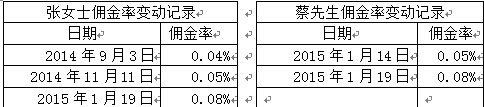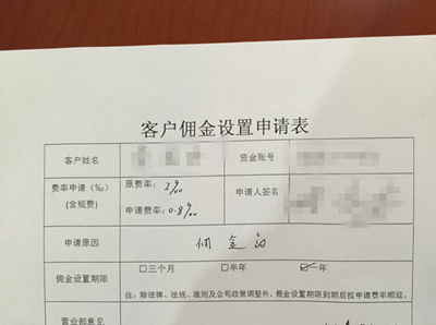 爆料人称,鉴于信任,蔡先生和张女士在交易过程未核查过佣金费用。直到2015年11月底,发现两人开户时的初次佣金率分别被设为万五和万四,并且期间出现多次调高佣金的现象,而两人均不知情,两人自开户后未去过营业部,也未签署过相关佣金修改表格。