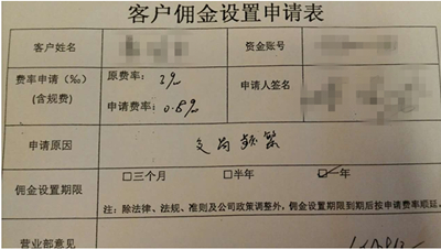 据了解,在爆料人要求何先生提供上调证券交易佣金率相关凭证后,何先生于2015年12月初拍照提供第1张蔡先生的《佣金设置申请表》,显示佣金率从3‰调整为0.8‰,原因为“交易频繁”,照片只有半页,未包含佣金申请日期信息。