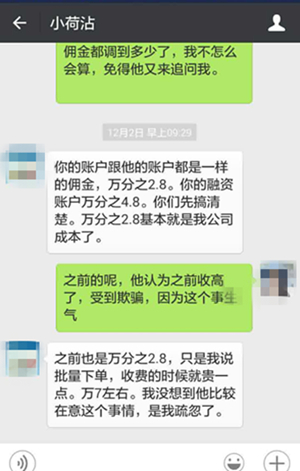 对此,2015年12月2日的微信聊天记录显示,何先生对张女士的解释是:“之前也是万分之二点八,只是我说批量下单,收费的时候就贵一点。万七左右。我没想到他比较在意这个事情,是我疏忽了。”