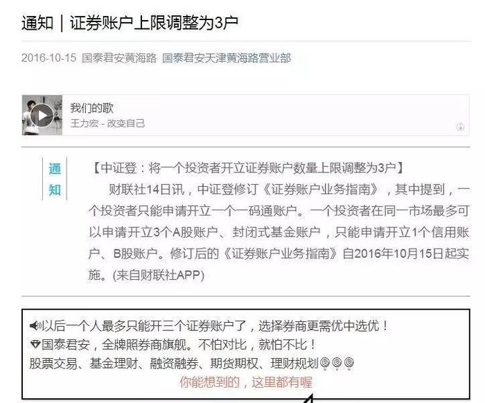 比如华泰证券,速度推出有针对性的营销方案,宣传语简单“霸道”:“炒股有泰度,何须三户”。