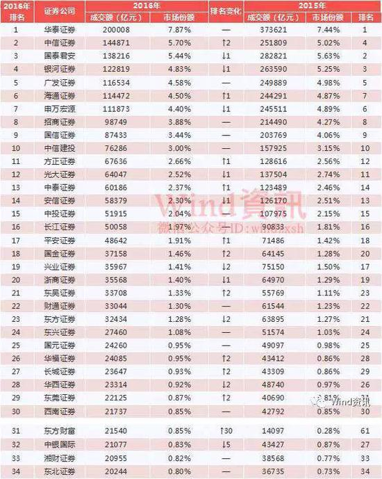 先来看看最直观的成交额。Wind统计,2016年有7家券商股基成交金额在10万亿元以上,市场占有率超过1%的券商共24家。
