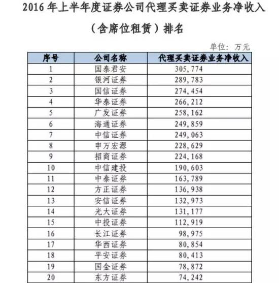 从成交额来看,华泰蝉联第一名,不过代理买卖净收入却排名较后,2015年中政协公布的数据显示,华泰证券代理买卖净收入只排名第七。