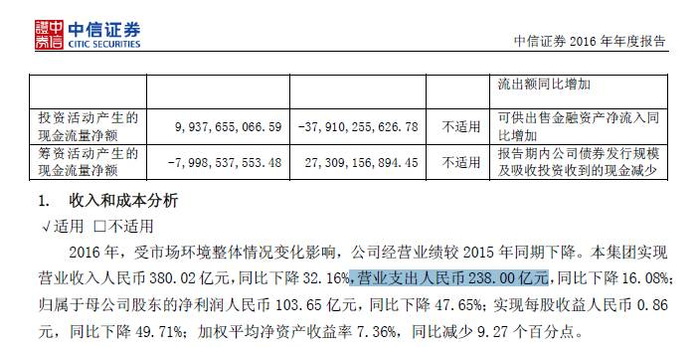 答案在成本上。中信证券营业支出达到238亿元,而国泰君安证券营业支出仅116.96亿元。