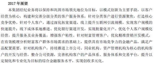 如果说上面的话题有点大,中信证券管理层在“关于公司未来发展的讨论与分析 ”章节中,还针对每一个业务在2017年的发展做了展望,比如经纪业务的2017年展望为: