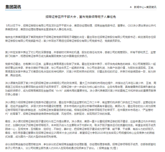 据招商局官网消息,5月10日下午,招商证券股份有限公司在深圳召开干部大会,集团总经理助理、招商金融党委书记、董事长、CEO洪小源出席会议并代表集团讲话,集团总经理助理褚宗生宣读有关人事任免决定。