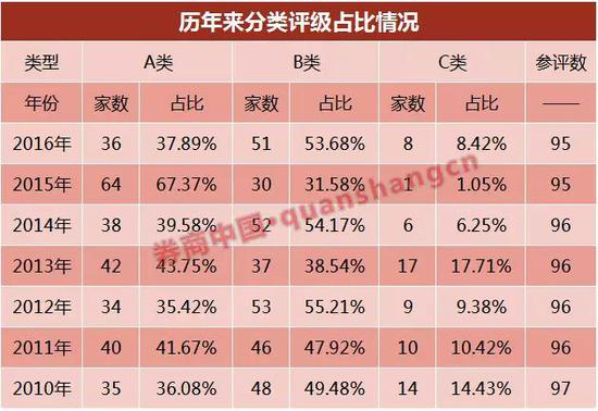 需要说明的是,从分类评级推出以来,无论是在中证协自律监管时代,还是纳入证监会以后,行业内努力追求的AAA级证券公司一直处于空白状态。庆幸的是,D类和E类证券公司也鲜有出现。