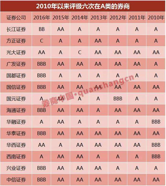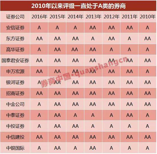 答案无疑是下面这12家:国泰君安证券、安信证券、高华证券、申万宏源、银河证券、招商证券、中金公司、中泰证券、中投证券、中信建投证券和中银国际证券,上述12家券商从2010年至2016年,均被评为A类券商。