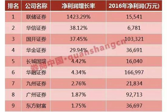 上述9家券商分别为,联储证券、华信证券、国开证券、华金证券、长城国瑞证券、华融证券、九州证券、广州证券及东方财富证券。券商中国记者发现,这9家券商净利逆势增长,除一些券商2015年基数较低因素外,经纪业务营收占比较低亦是重要因素,另外,还有券商在2016年在融资、业务资格方面获得了较大突破,业务亦顺势爆发。