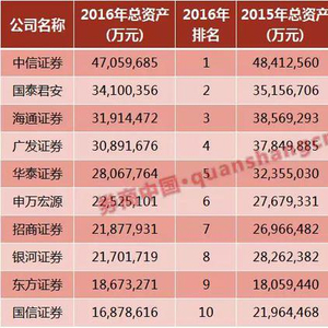 在总资产排名这一指标上,前十的券商排位出现调整,最显著变化是国泰君安由2015年第4上升至2016年的第2位,不过前十大券商阵营并未变化,今年排名前十券商为: