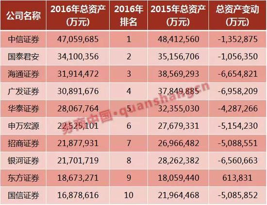 值得注意的是,据券商中国记者统计,除了东方证券之外,其他9家券商总资产规模相比较2015年全部下滑,缩水最严重的为广发证券、海通证券和银河证券三家。其中广发证券总资产规模由2015年的3784.99亿元缩水至2016年的3089.17亿元,总缩水量达到695.82亿元,海通证券总资产规模相比2015年缩水665.48亿元,银河证券总资产规模相比2015年缩水656.07亿元。