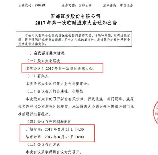 国都证券公告显示,公司2017年第一次临时股东大会将于2017年8月25日14:30召开,主要审议《关于补选张树忠先生为第一届董事会董事的议案》议案内容,补选张树忠为公司第一届董事会董事。该股东大会时长3个半小时,将于当日晚间六点结束。