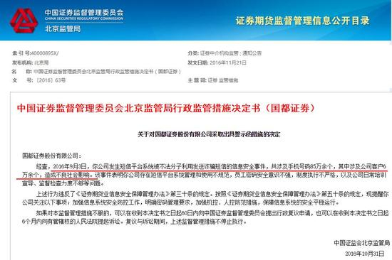 券商中国记者结合分类监管新规统计发现,国都证券在2017年度评价期内,其“成本管理能力、脱贫攻坚等社会责任履行情况专项评价、净资本超过规定标准达一定比例、主要风控指标持续达标”均达到了加分标准,但由于去年10月份因“短信平台被不法分子利用向84万客户发送诈骗短信”,被北京证监局出具警示函,遗憾落选A类券商。