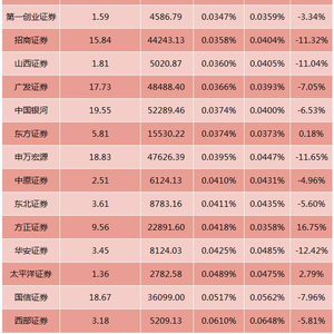 分券商来看,下降较多的主要有国泰君安证券(万4.01→万3.22)、长江证券(万3.62→万3.16)、华安证券(万4.85→万4.25)、申万宏源证券(万4.47→万3.95)、招商证券(万4.04→万3.58)、山西证券(万4.05→万3.6)和国元证券(万3.60→万3.22)。