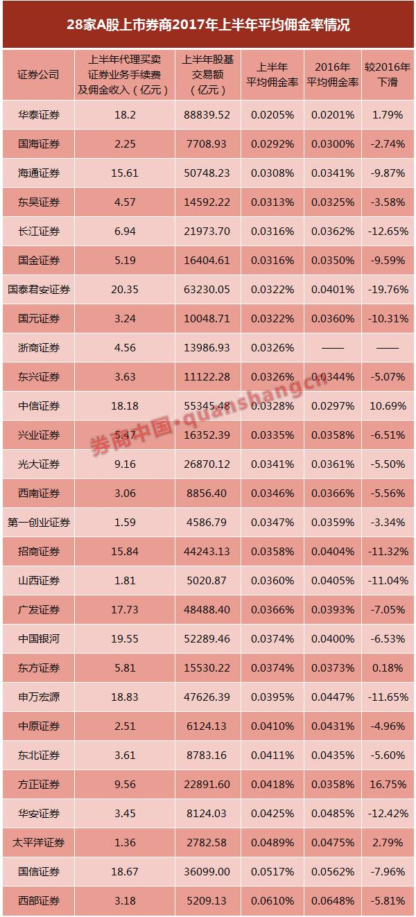 28家上市券商全部披露2017年半年报。我们通过半年报数据与同期股基成交金额的计算,估算得出各家券商经纪业务的佣金率水平。