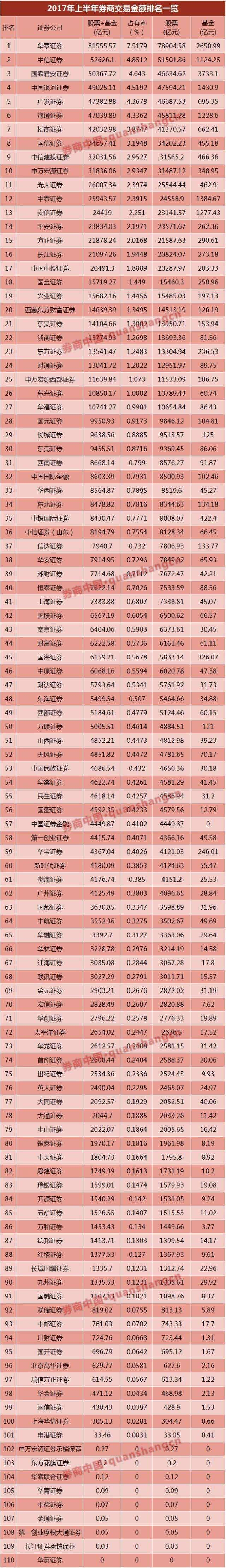 上半年,沪深交易所统计了110家券商的股基交易量,华泰证券依然稳居第一,股基交易量8.16万亿,市场占有率为7.52%。