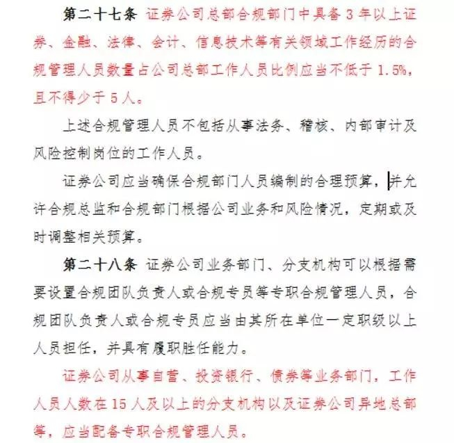 不过还有一条规定,证券公司从事自营、投资银行、债券等业务部门,工作人员人数在15人及以上的分支机构以及证券公司异地总部等,应当配备专职合规管理人员。