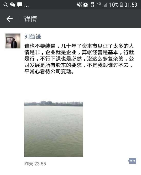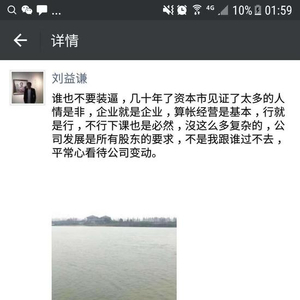 26日晚间,刘益谦在朋友圈疑似回应邓晖离职事件,称“谁也不要装逼,几十年了资本市场见证了太多的人情是非,企业就是企业,算账经营是基本,行就是行,不行下课也是必然,没这么多复杂的,公司发展是所有股东的要求,不是我跟谁过不去,平常心看待公司变动。”