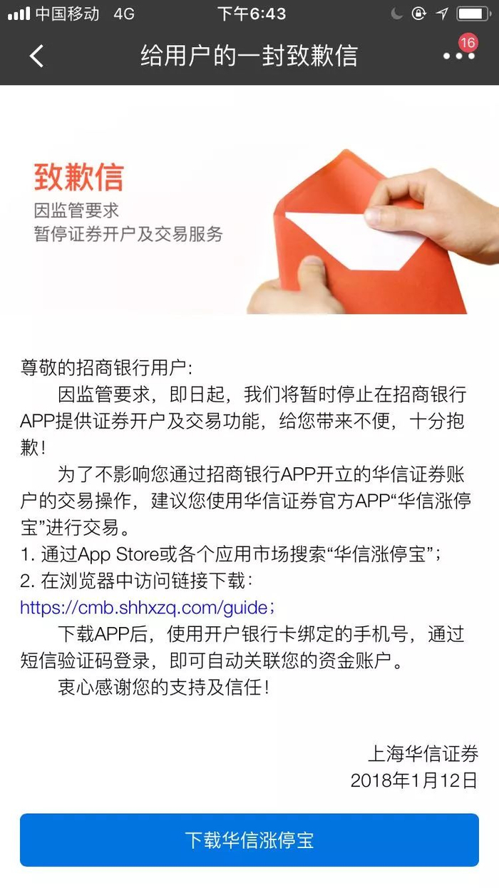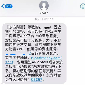 昨日晚间,东方财富证券向客户发送短信通知称,“因近期业务调整,即日起我们将暂停在工商银行APP平台上的证券服务,给您带来不便十分抱歉。为了不影响您的正常交易,请您提前下载东方财富APP。”