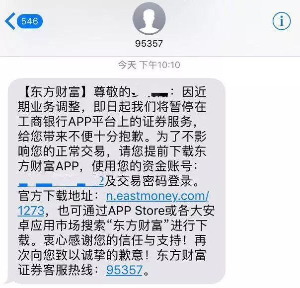 昨日晚间,东方财富证券向客户发送短信通知称,“因近期业务调整,即日起我们将暂停在工商银行APP平台上的证券服务,给您带来不便十分抱歉。为了不影响您的正常交易,请您提前下载东方财富APP。”