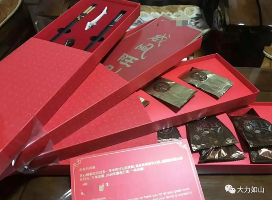 某咨询公司:通知发年终奖的邮件连条毛线也没见着,就是这四盒玩意儿,茶叶3包,核桃酥6包筷子两双外加两副筷子架,自家公司logo利是封10只,公司logo门头贴3张,还有感谢信一封,如下图: