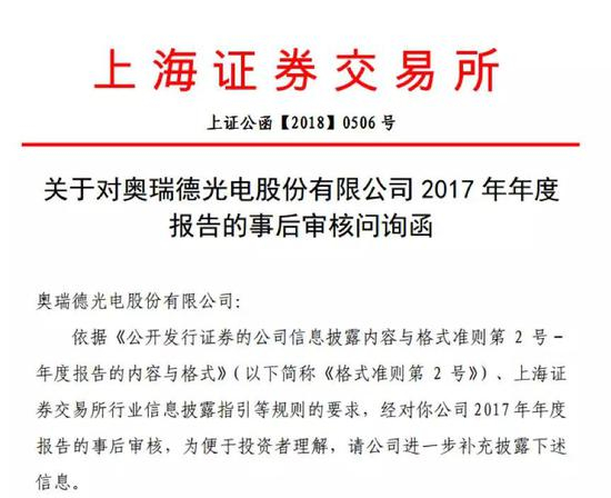 上交所也于2018年5月14日对奥瑞德下发了问询函,针对公司分季度数据异常、应收账款及关联方欠款、业绩承诺及补偿、债务风险等方面进行了问询。