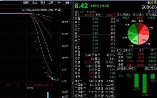 停牌一年的奥瑞德(600666.SH)于2018年5月4日复牌,复牌后,遭遇连续8个一字跌停,市值蒸发超过120多亿。