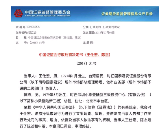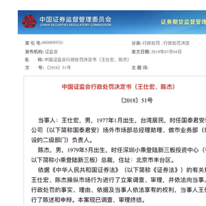因三年前的做市“砸盘”事件,时任国泰君安场外市场部总经理助理、做市业务部负责人王仕宏和其合伙人陈杰近日各领证监会100万元罚单。