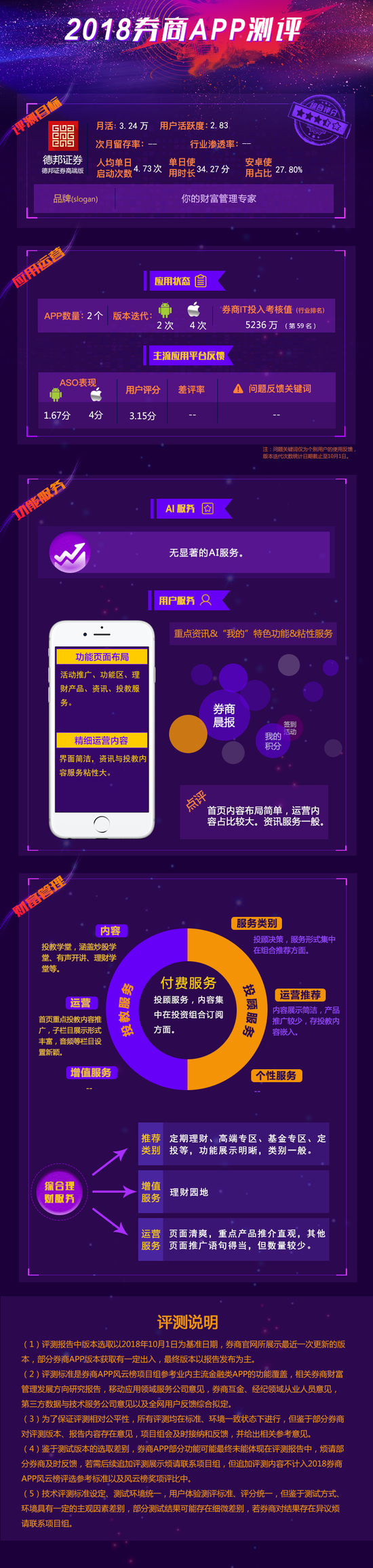 本期评测目标为德邦证券APP德邦证券高端版。体验评测中,德邦证券高端版投教服务中有声开讲差异性突出,投顾服务表现一般。付费内容集中在投资组合订阅方面。理财服务方面,金融产品分类表现有待提高。