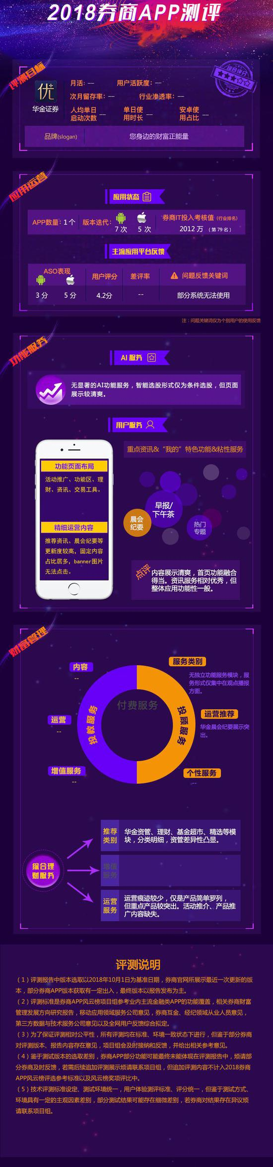 本期评测目标为华金证券APP优+理财。体验评测中,优+理财理财服务较突出,资管服务差异性凸显,投教、投顾服务均缺失。