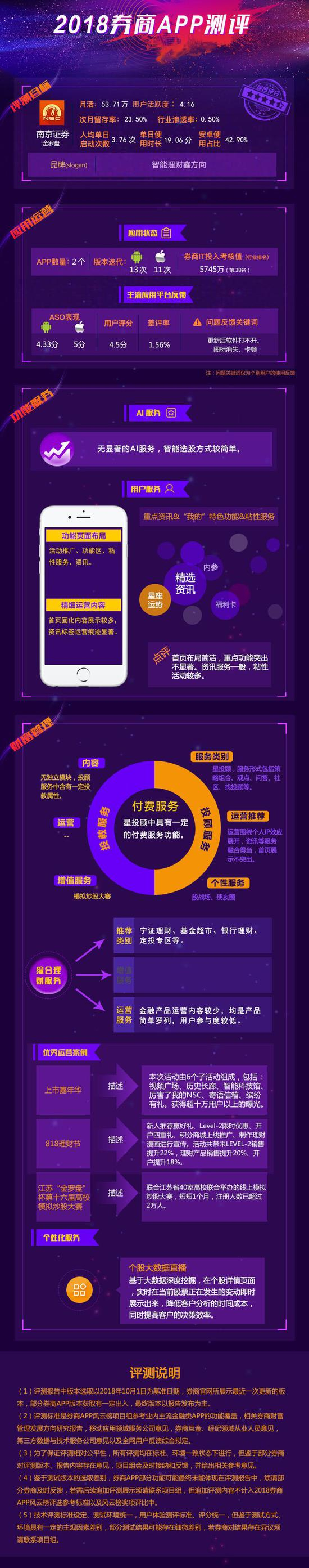 本期评测目标为南京证券APP金罗盘。体验评测中,金罗盘AI服务智能选股方式较简单,无独立投教服务模块,星投顾服务全面,股战场、朋友圈功能差异性凸显。理财服务中宁证理财品牌化较强,基金超市、银行理财等产品类别较丰富。