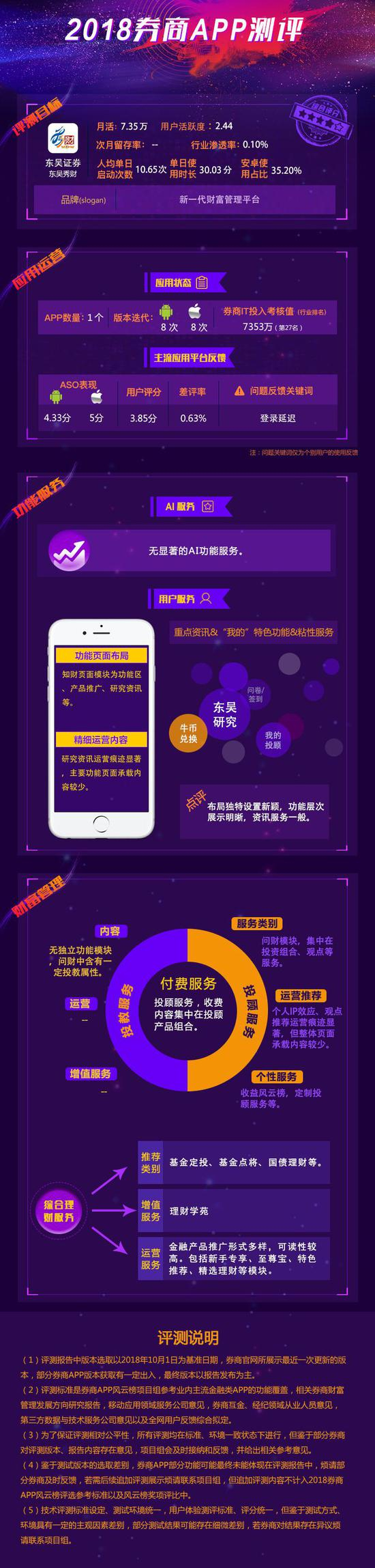 本期评测目标为东吴证券APP东吴秀财。体验评测中,东吴秀财页面功能模块设立独特,布局清爽。投教、投顾服务提升空间较大。理财方面,金融产品推广形式多样,可读性较强。