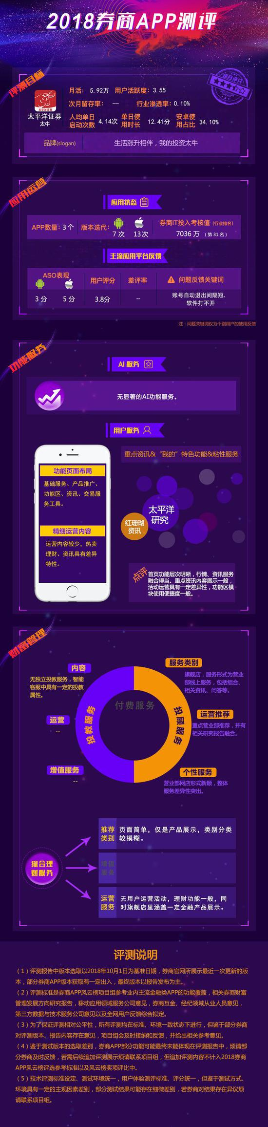 本期评测目标为太平洋证券APP太牛。体验评测中,太牛资讯服务表现突出,红珊瑚资讯、太平洋研究等服务粘性度高,投顾服务中旗舰店概念新颖,服务多元化。投教、理财服务提升空间较大。