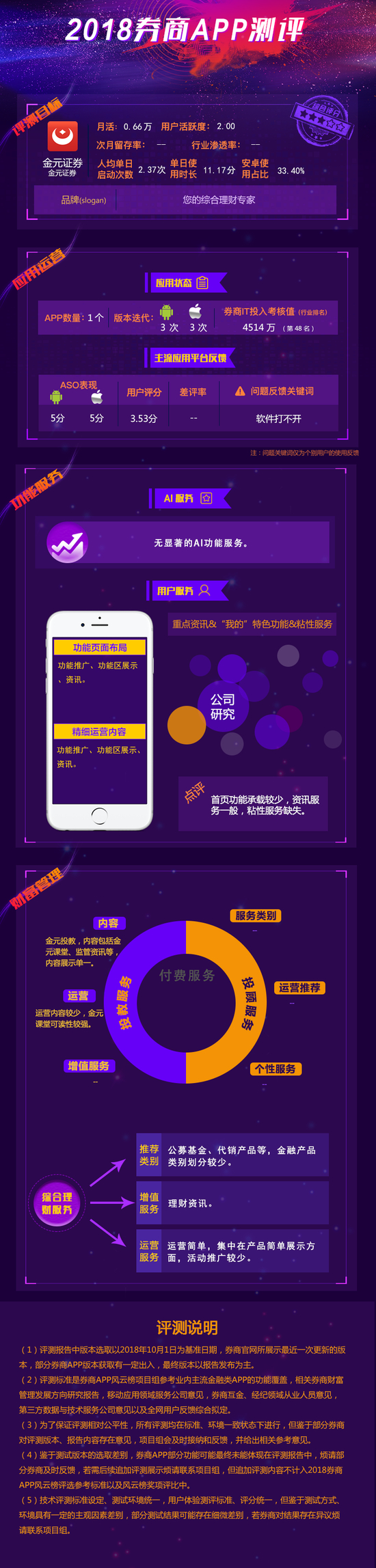 本期评测目标为金元证券APP金元证券。应用运营评测中,金元证券平台ASO表现优秀,安卓和IOS平台均为3次。体验评测中,金元证券投教服务相对突出,包括金元课堂、监管资讯等,投顾服务缺失,理财服务包括基金、产品代销等,服务提升空间较大。