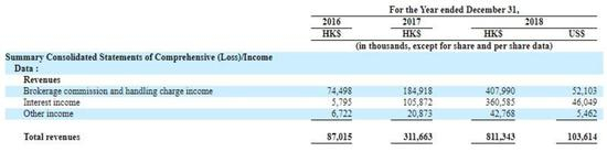 招股书显示,富途以8.11亿港元的营收在2018年实现净利润扭亏为盈,2016年至2018年复合年增长率高达205%。富途2017年收入为3.117亿港元,较2016年的8701万港元增长258.2%;净利润则从2016年的亏损9847万港元收窄至2017年的亏损810万港元,并在2018年实现净利润1.385亿港元(合计1769万美元)。