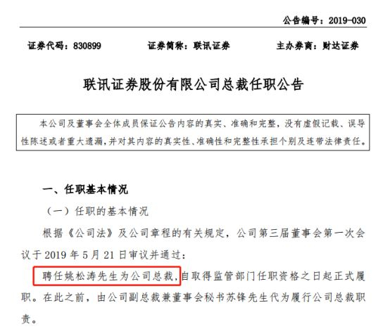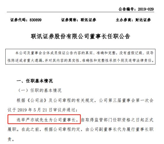 5月21日,联讯证券第三届董事会第一次会议审议通过,选举严亦斌先生为公司董事长,自取得监管部门任职资格之日起正式履职。在此之前,根据公司章程约定,由公司副董事长代为履行董事长职责。聘任姚松涛先生为公司总裁,自取得监管部门任职资格之日起正式履职。在此之前,由公司副总裁兼董事会秘书苏锋先生代为履行公司总裁职责。