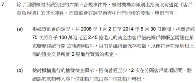 在 2008 年 1 月 2 日至 2014 年 5 月 30 日期间,招商证券(香港)曾经75 次将 100 万港元至 2.45 亿港元的资金,由客户信托账户转账至两个在某家联属经纪行开立的结算账户,目的是维持最低存款额,以便符合在深圳和上海的证券交易所就 B 股进行买卖的规定。