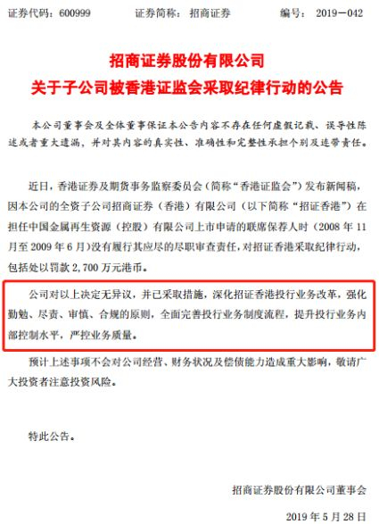 5月28日,招商证券针对27日港证监公布的2700万港元的处罚表示,公司对以上决定无异议,并已采取措施,深化招证香港投行业务改革,强化勤勉、尽责、审慎、合规的原则,全面完善投行业务制度流程,提升投行业务内部控制水平,严控业务质量。