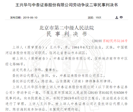 中泰证券员工离职后讨要10万绩效 仲裁起诉均失败