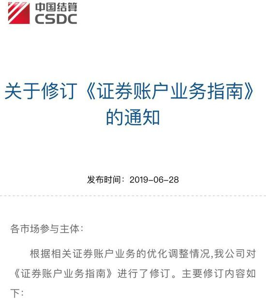 28日,中国结算第六次修订了《证券账户业务指南》,共修订了三大项内容,比如将不合格账户解除权限下放给券商;完善表述,新增外国自然人可以开设A股账户,进一步放开对外开放A股市场等。修订后的指南自2019年7月1日起实施。