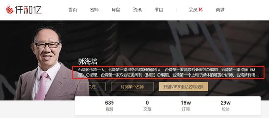 记者在仟和亿网站看到,网站中推介的20位“名师”除了廖英强外,其他大多有在台湾的相关从业经历。例如,其中郭海培的简历为“台湾股市第一人,台湾第一家报纸证券版的创办人、台湾第一家证券专业报纸总编辑、台湾第一家投顾(财星)总经理、台湾第一家专业证券周刊(财星)总编辑、台湾第一个上电子媒体的证券分析师。”